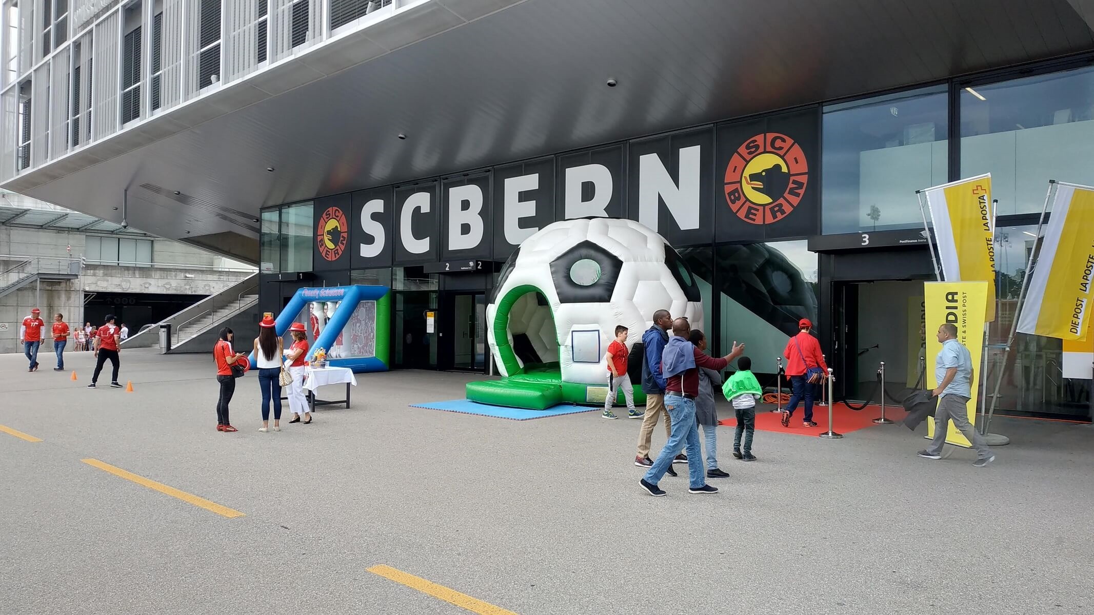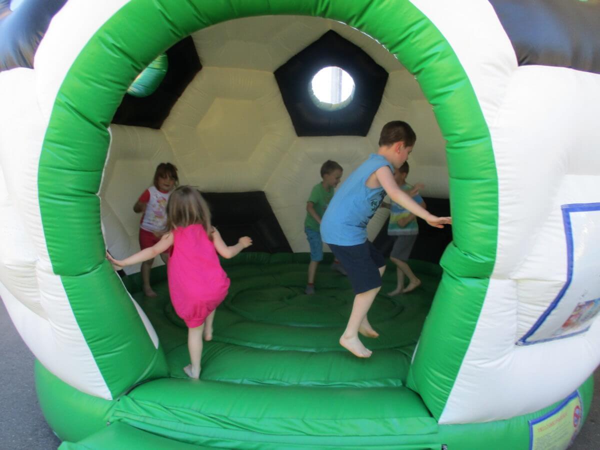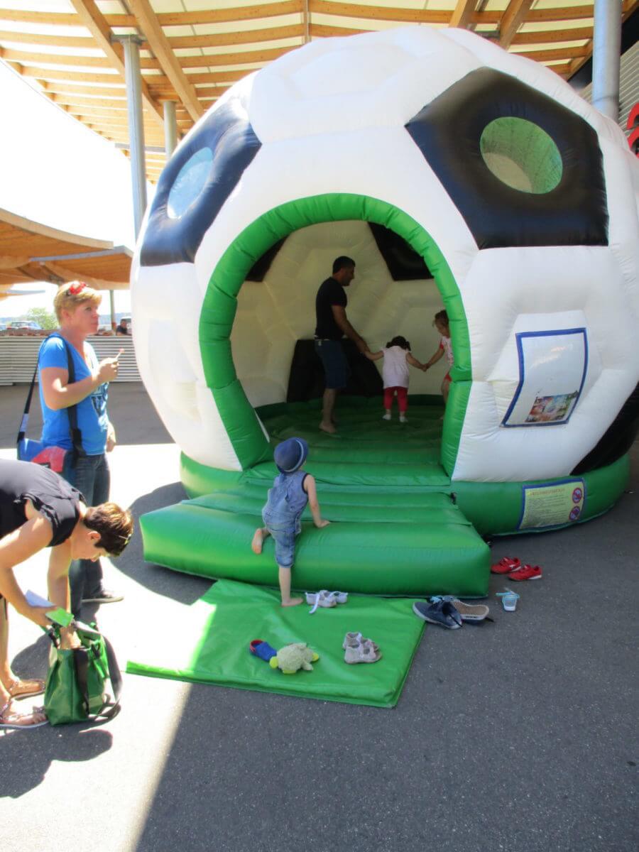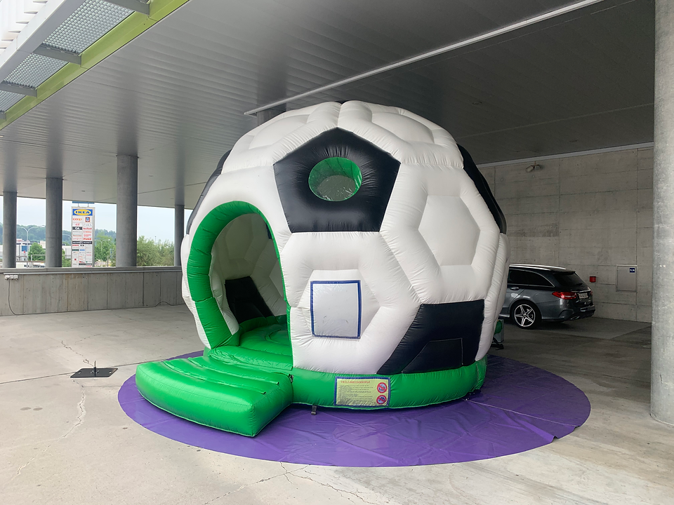 Unsere allseits beliebte Hüpfburg Fussball ist ideal für mittlere bis grosse Anlässe. Hier können bis zu 10 Kinder toben, springen und hüpfen. Diese Hüpfburg bietet ein Dach zum Schutz vor Regen und zu hoher Sonneneinstrahlung. Die Hüpfburg in Form eines Fussballs darf bei keinem Fussball-Event fehlen.