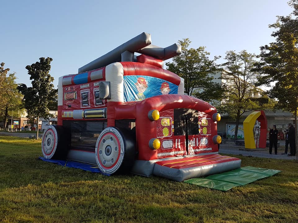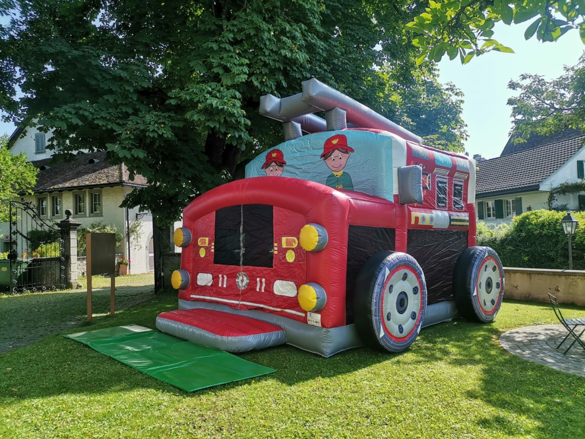 Tatütata: Unsere Feuerwehr-Hüpfburg ist bereit für den Einsatz auf Ihrem Event! Im Inneren des riesigen Feuerwehrwagens können sich bis zu 12 kleine Feuerwehrmänner und -frauen gleichzeitig nach Lust und Laune austoben. Neben einer grossen Hüpffläche bietet die Feuerwehr-Hüpfburg zahlreiche Spielobjekte, die für viel Spass und Abwechslung sorgen. Die hohe Umrandung bietet Sicherheit, wenn es in der Hüpfburg heiss hergeht. So kommt mit Sicherheit keine Langeweile auf!