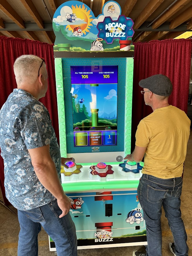 Die Spieler müssen auf einem 50 Zoll FullHD Display versuchen mit der Biene so weit wie möglich durch die Hindernisse, die hier aus Säulen bestehen, zu fliegen. Durch Drücken des Buttons fliegt die Biene nach oben, wenn man nicht drückt fliegt sie langsam nach unten. Es können bis zu 3 Spieler gleichzeitig spielen und es ist ein Reaktionsspiel für Jung und Alt. Der Spieler, der den Highscore übertrifft, gewinnt den Jackpot. Arcade Buzz ist eine Kombination aus schönem Design, einem soliden Metallgehäuse und viel Spaß.
