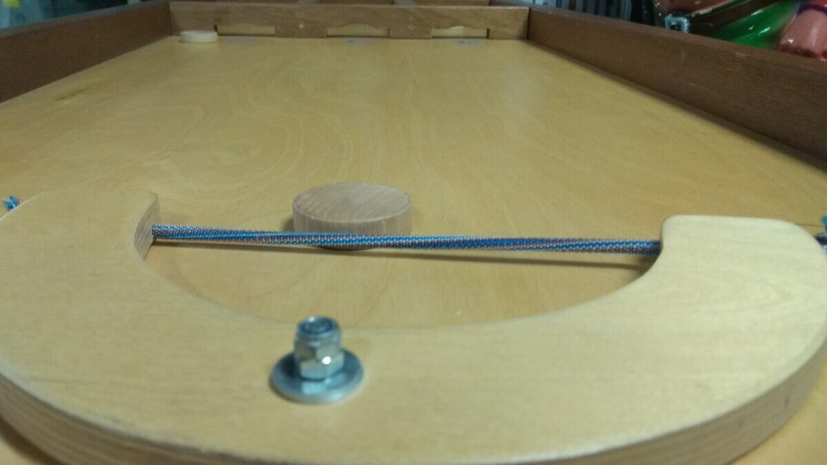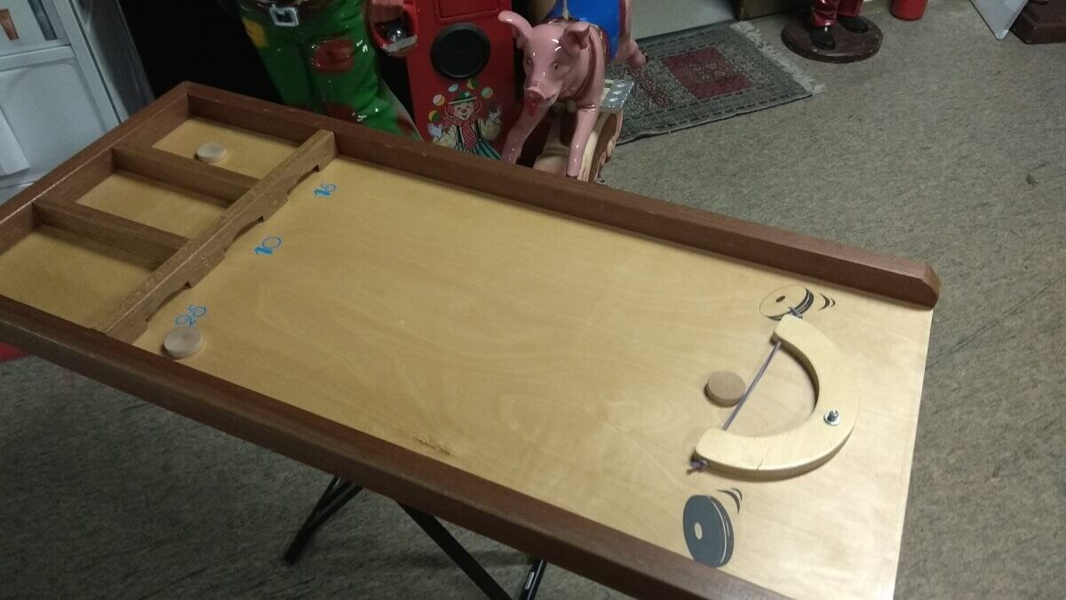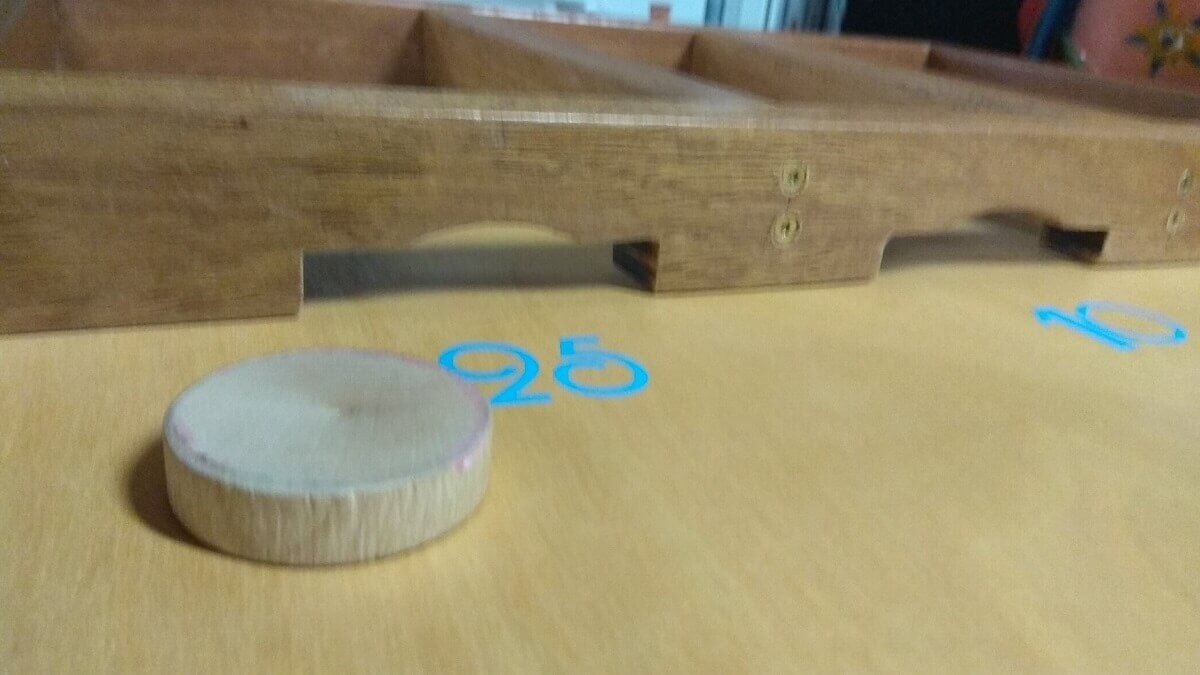 Holz Tischspiel bei dem man wie ein Boomerang die Steine in die Punktefelder jagen muss….