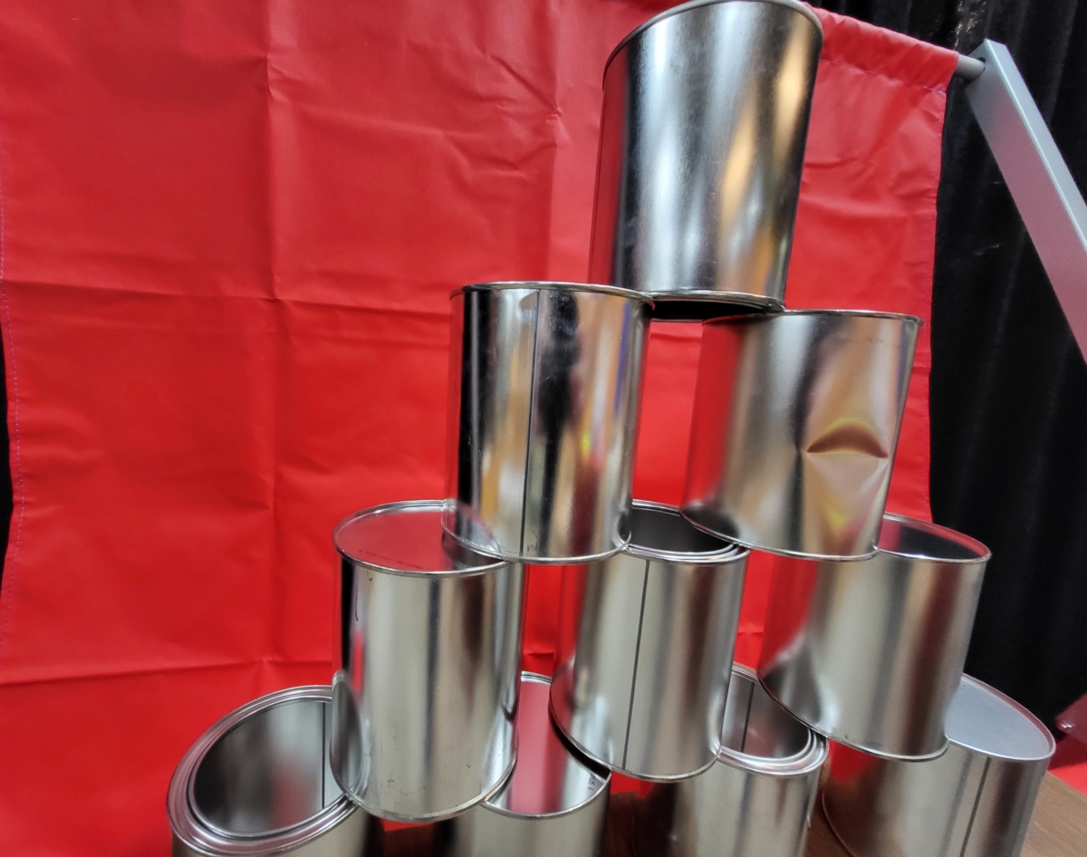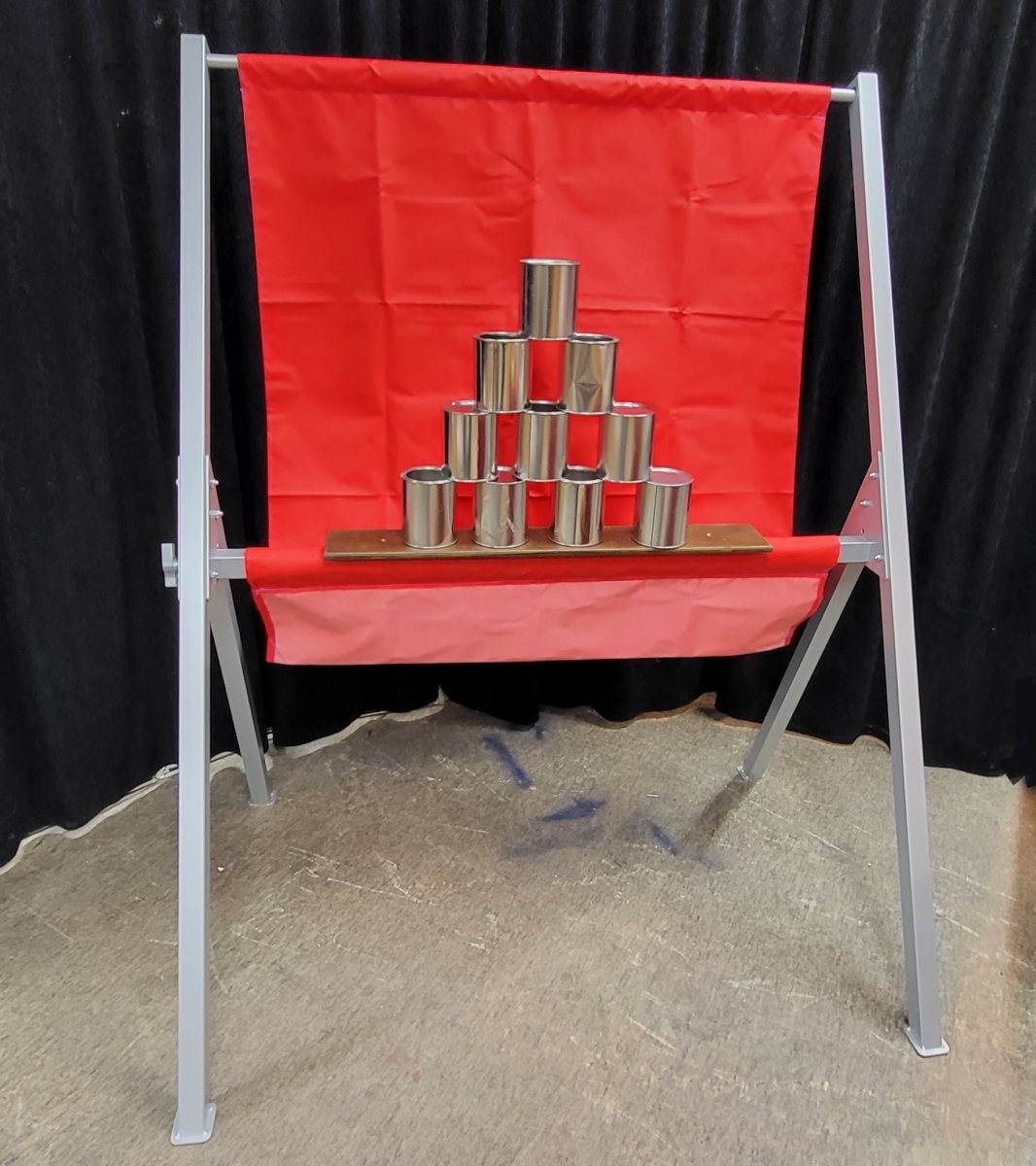 Der Dosenwurfstand kann in verschiedenen Farben gemietet werden. Das Grundgestell ist immer in Metall in rot oder weiss pulverbeschichtet.