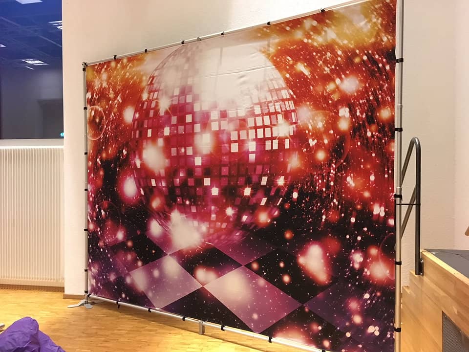 Lieferumfang: Gestell zerlegbar mit bedrucktem Stoff zum Anhängen.