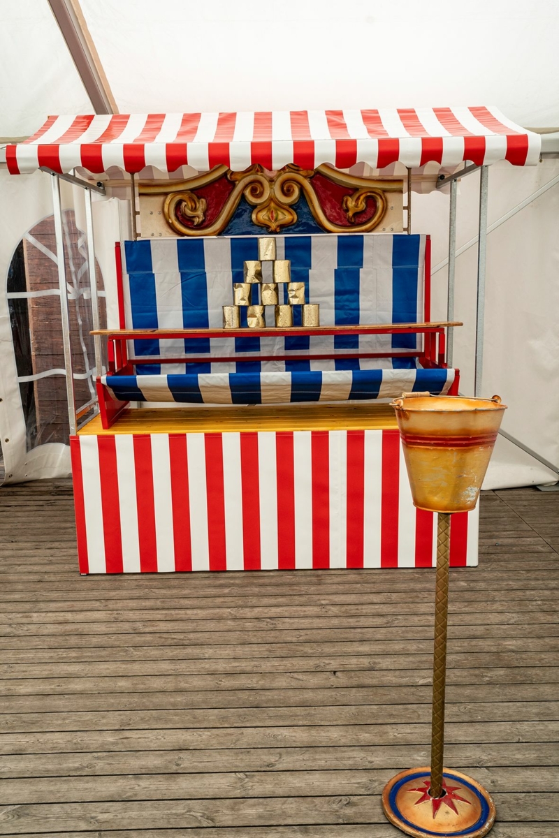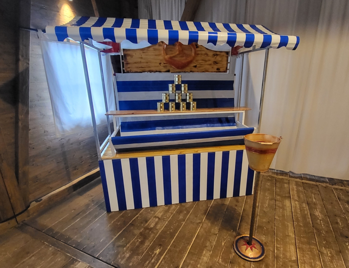 Spielstand „Dosenwerfen Oktoberfest“. Sie erhalten einen blau-weiss dekorierten Marktstand mit Dosenwerfen-Aufsatz. Dazu eine Abwurfstation und natürlich die Dosen und Bälle.