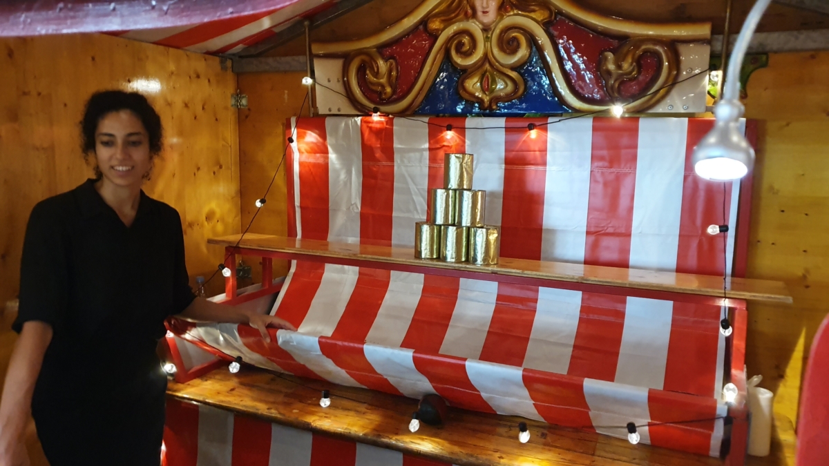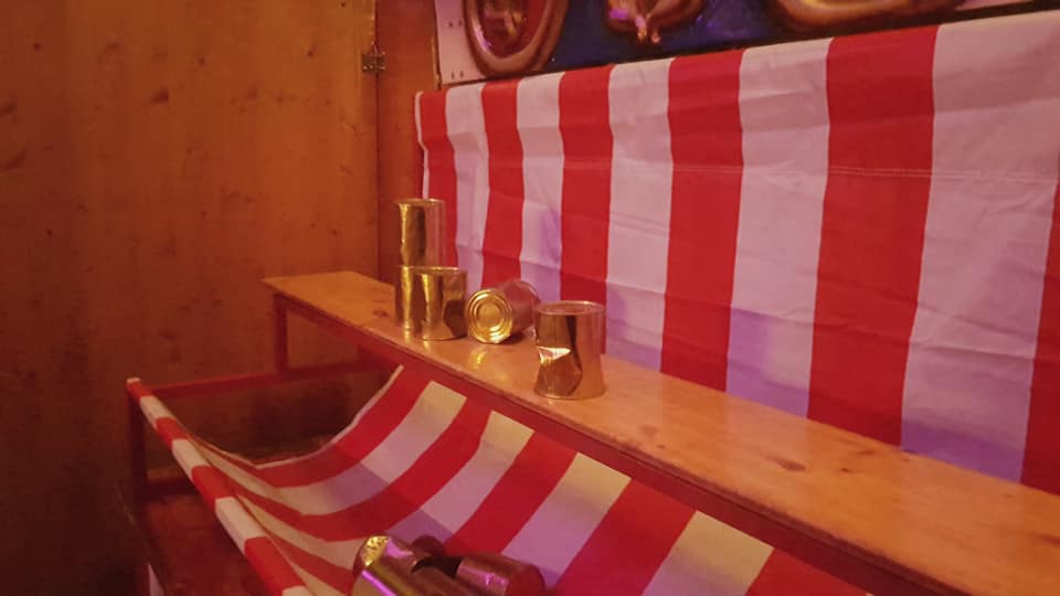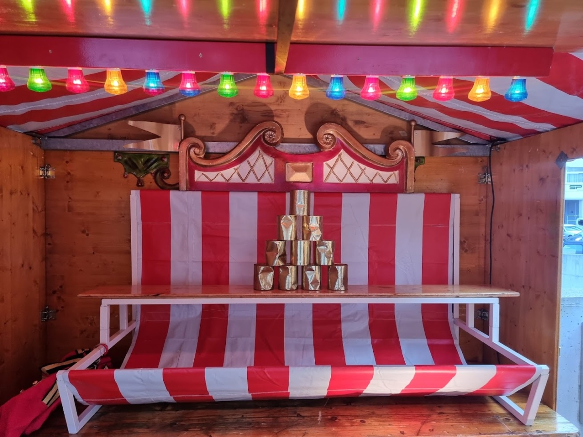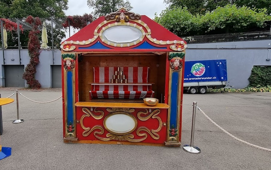 Der Jahrmarktsklassiker schlechthin. Beim Büchsenwerfen versuchen die Teilnehmer gezielt mit drei Bällen einen Stapel von 10 Dosen zu treffen und möglichst komplett vom Regal zu räumen. Nicht nur Kraft, sondern auch Zielvermögen und Treffsicherheit sind bei diesem scheppernden Vergnügen gefragt. Das Nostalgie Dosenwerfen mit ansprechend dekorierter Jahrmarktsbude.