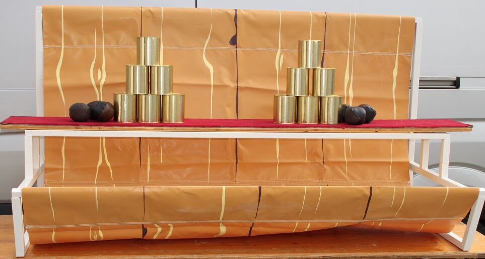Lieferumfang: Tisch, Aufsatz, Abwurfständer, Bälle, Dosen.