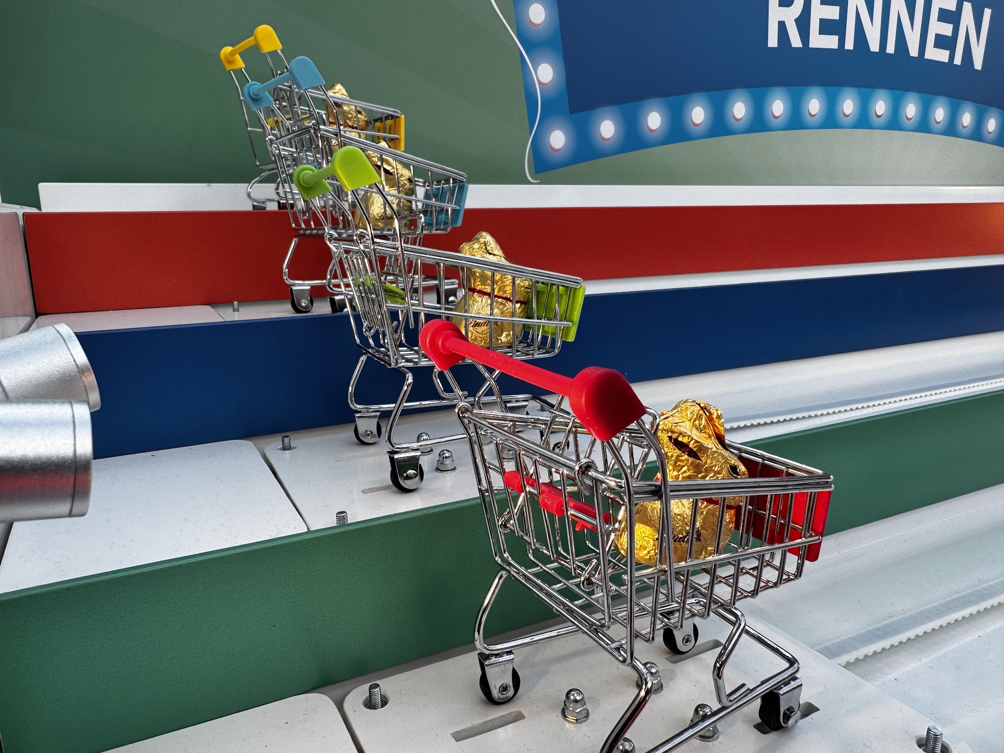 Das Kultspiel darf auf keinem Jahrmarkt und keiner Chilbi (häufig auch als Kamelrennen) fehlen. Jetzt haben Sie die Chance, es als hochwertiges Promotion-Tool für Ihr Event zu nutzen. Unser Einkaufwagen Rennen für vier Spieler ist kompakter als die Originale und daher leicht zu transportieren und auch in kleineren Eventlocations einsetzbar.