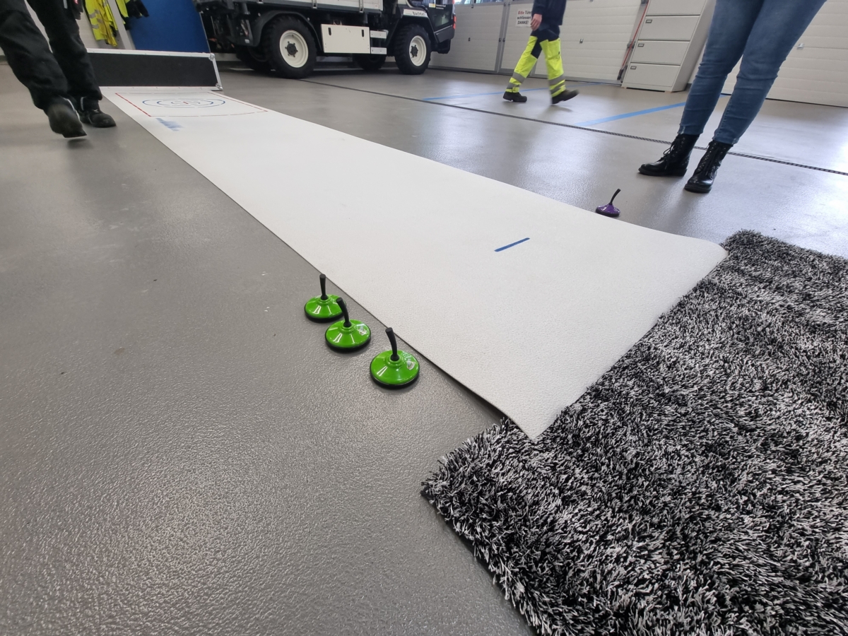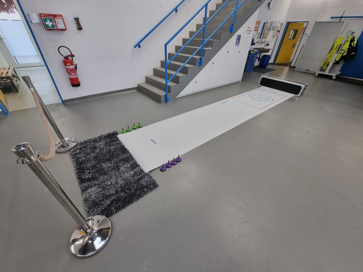 Lieferumfang: 1 Rolle Spielfeld, Mini Eisstöcke, Teppich, Absperrpfosten.