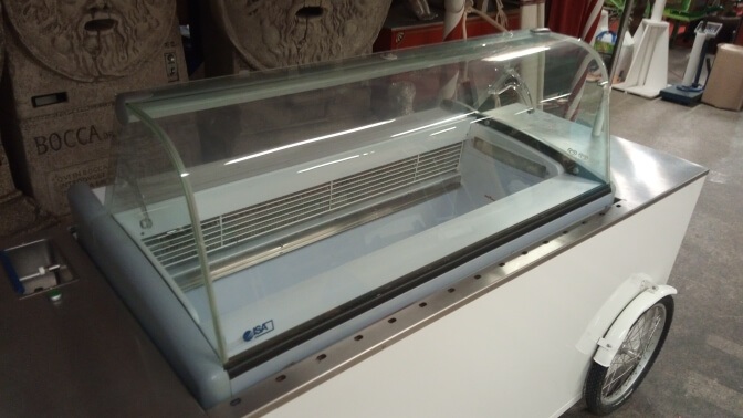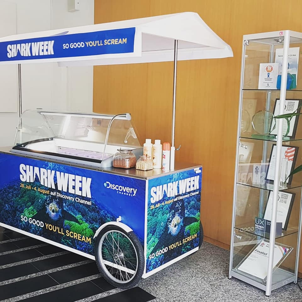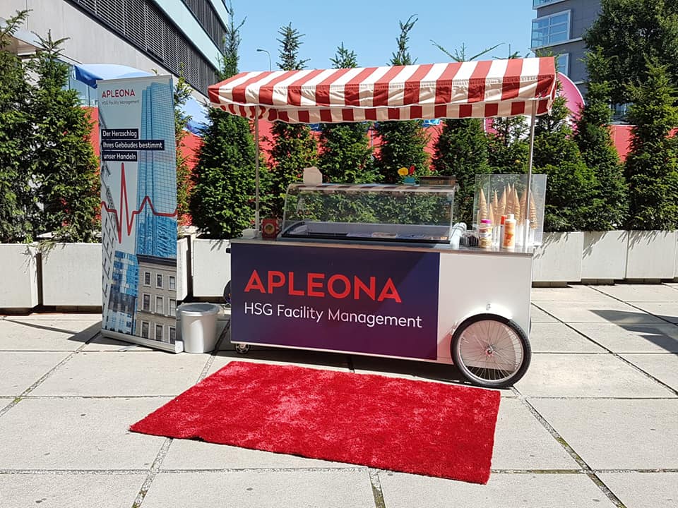 Mit unserem Eiswagen bringen Sie eiskalten Genuss auf Ihr Event. Der Wagen überzeugt mit einer modernen technischen Ausstattung und tollem Design mit Ihrem Branding. Neben der Kühlung für die verschiedenen Eissorten verfügt er über ein extra Gefrierfach für Vorräte sowie einen Warm- und Kaltwasseranschluss. Das rot-weisse Dach dient als Sonnen- und Regenschutz.