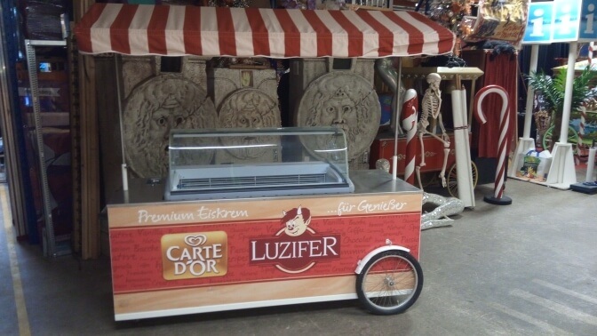 Lieferumfang: Eiswagen auf Rollen, Arbeitsmaterial, Kabelrolle, Auf- & Abbauanleitung.