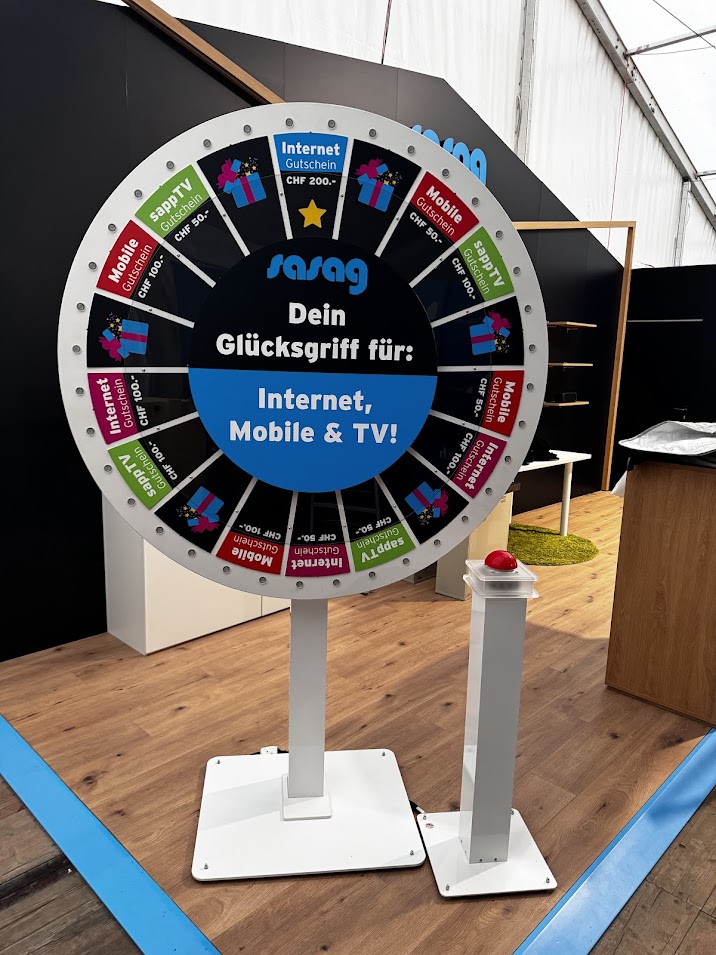 In der Gestaltung sind wir frei und können die gesamte Elektronik in verschiedenen Gehäuseformen unterbringen. Standardmässig bieten wir unser rundes Glücksrad mit einem Durchmesser von 140cm und 24 Feldern an. Hier haben Sie verschiedene Brandingmöglichkeiten der einzelnen Felder sowie auf der grossen Zentrumsscheibe.
