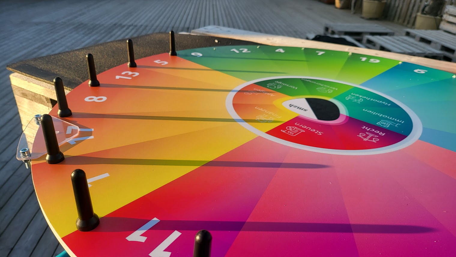 Das Glücksrad Professional mit einem Scheibendurchmesser von 90 cm bringt eine garantierte Einsetzbarkeit von 10.000 Spielen.