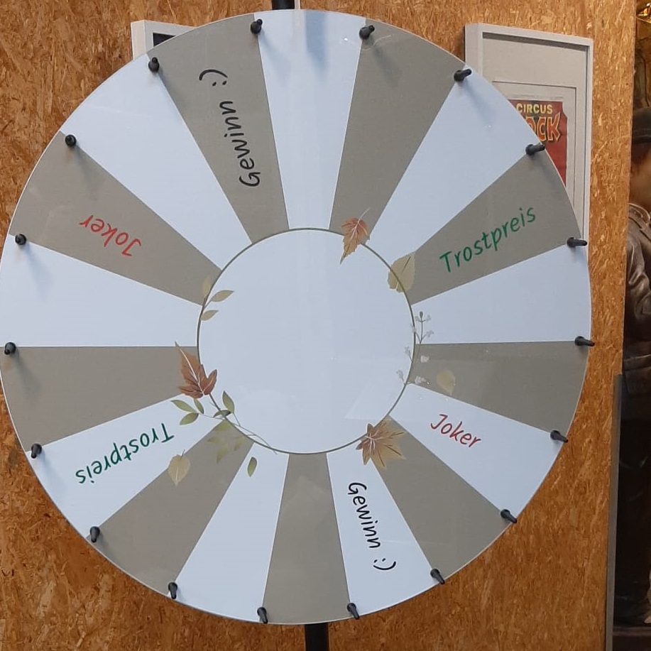 Die Grundscheibe kann mit Ihrem individuellen Layout bedruckt werden oder Sie wählen aus unseren Standard-Glücksradmotiven Ihr Wunschmotiv aus. Bei dieser Variante hat das Glücksrad eine Acrylglasscheibe vorne, sodass dieses mit einem Boardmarker leicht beschriftbar ist. Ebenso einfach können Sie dies auch wieder wegwischen. So sind Sie bei Ihrem Auftritt immer flexibel!
