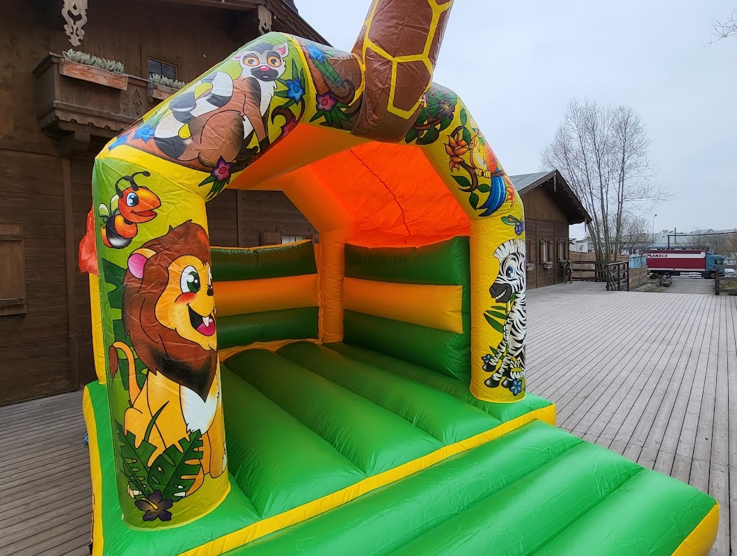 Unsere Midi Hüpfburgen sind ideal für den Indoor-Einsatz mit geringer Deckenhöhe. Hier können immer bis zu 6 Kinder gleichzeitig hüpfen. Hier schon von weitem zu sehen im Dschungel Thema: der grosse Giraffenkopf!