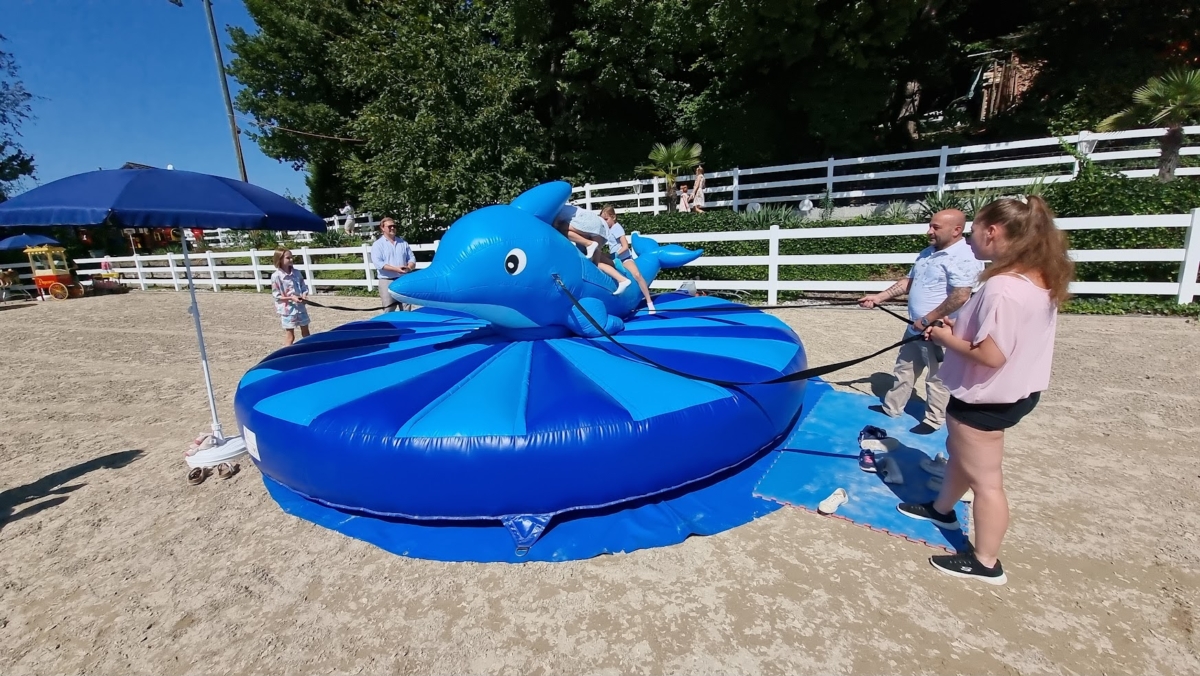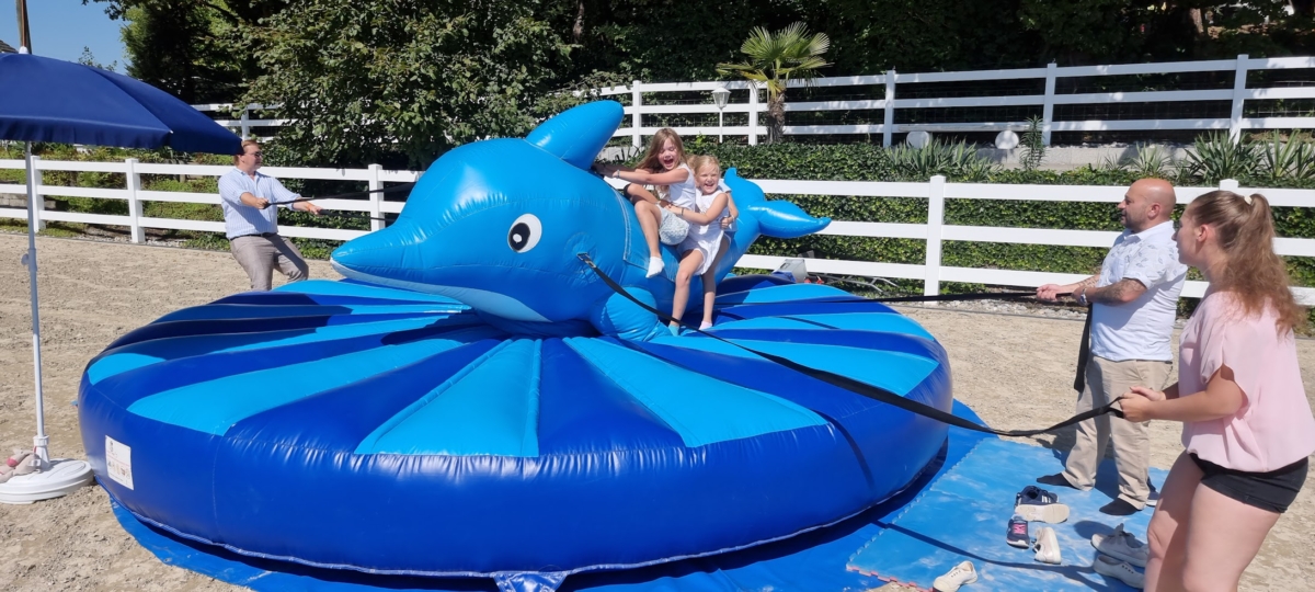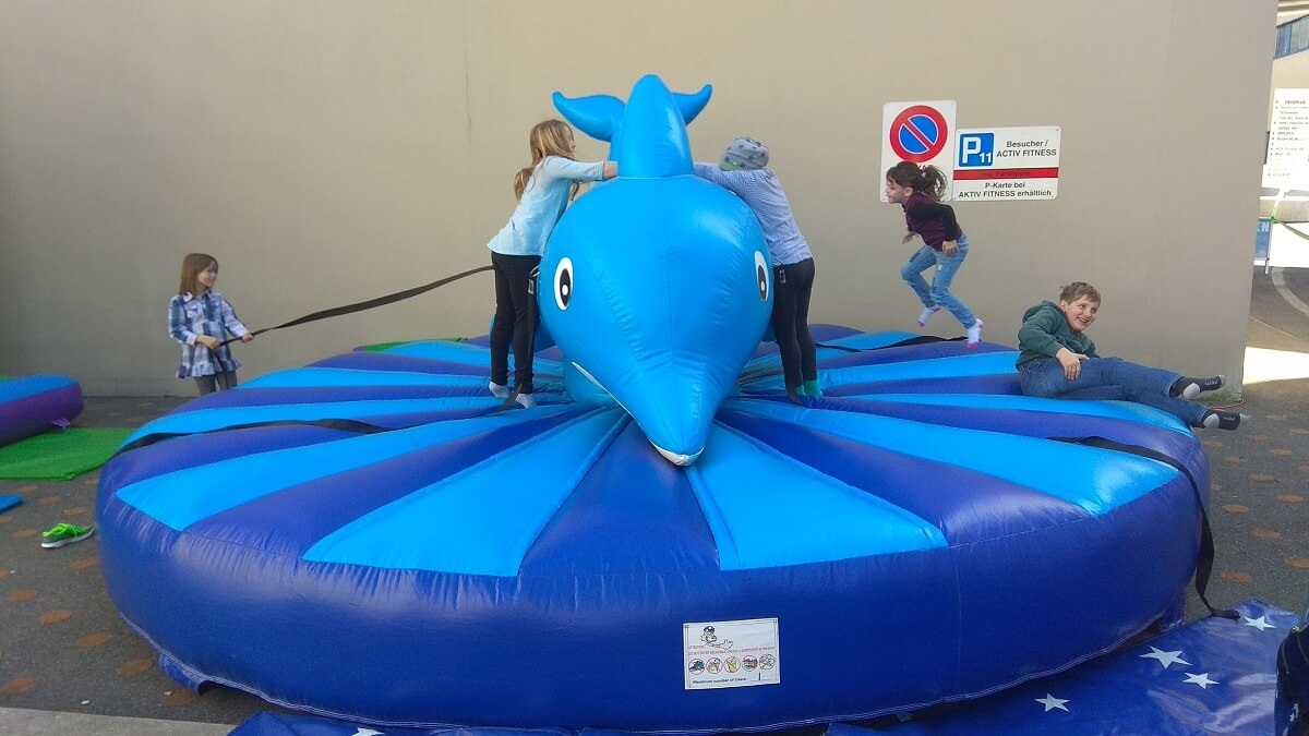 Bei unserem Kinder-Rodeo, auch »Pullriding» genannt, können schon die Kleinsten in die Rolle mutiger Seebären schlüpfen. Der grosse Delfin ist ein echter Hingucker und schürt die Vorfreude auf den wilden Ritt über die Weltmeere. Der besondere Clou des Kinder-Rodeos ist sein Antrieb, der von vier Personen gewährleistet wird, die den Delfin über Seile steuern und versuchen, den Reiter mit schnellen Bewegungen aus dem Sattel zu befördern. Anders als bei den herkömmlichen mechanischen Bullriding-Anlagen sind hier also gleich mehrere Personen in den Rodeo-Spass eingebunden.
