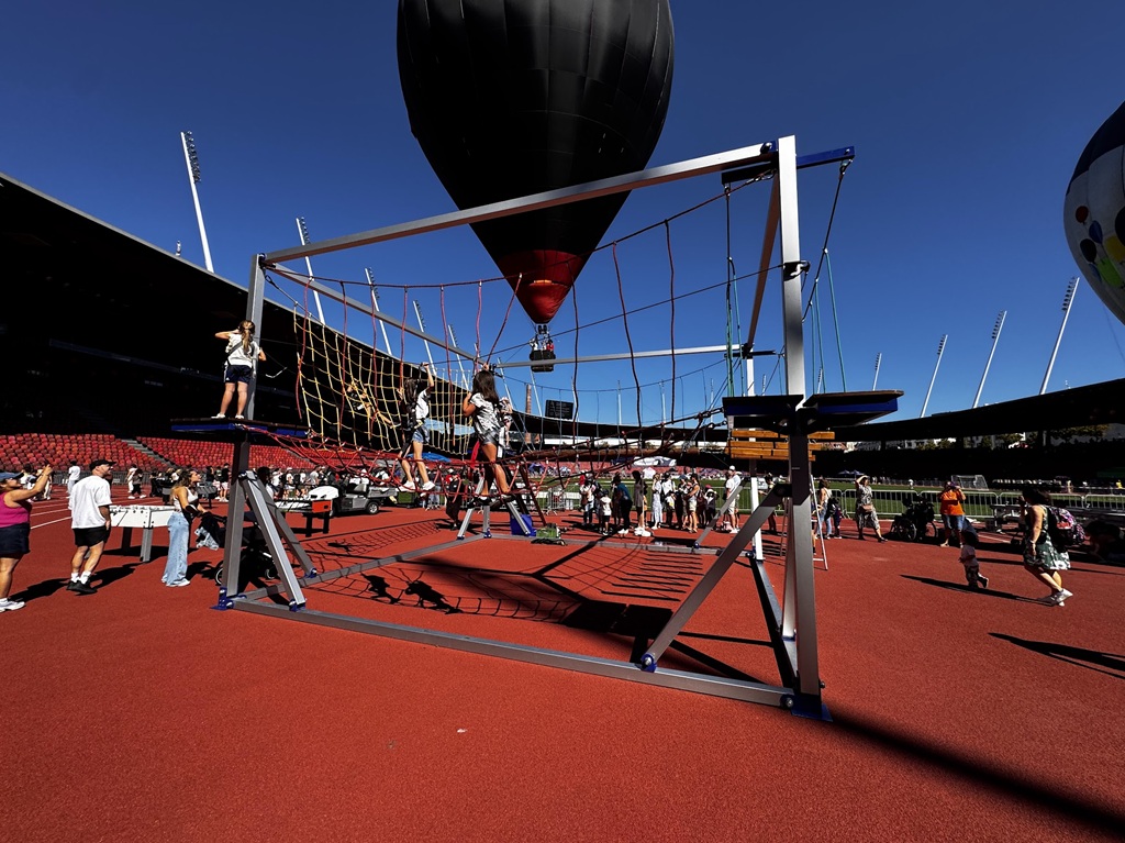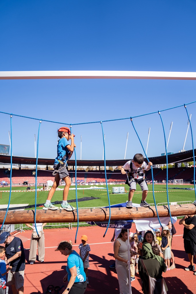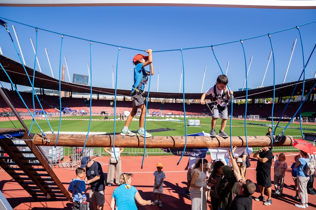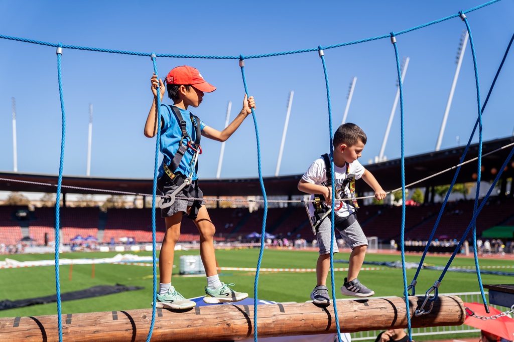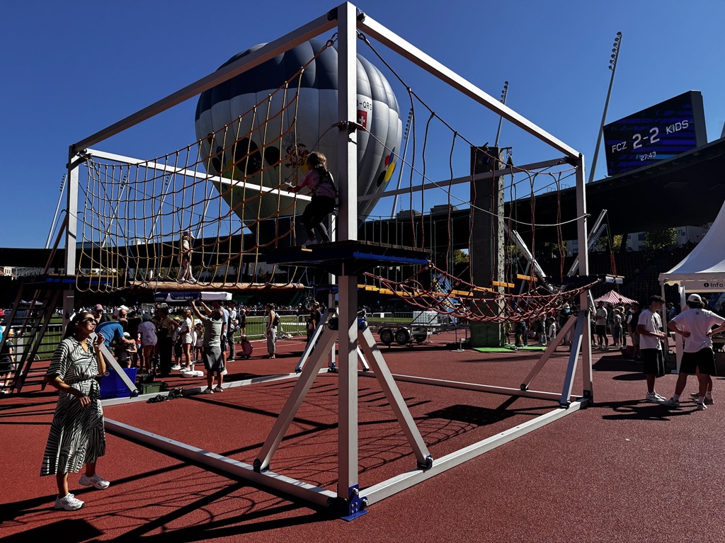 Bei diesem futuristischen wie kindgerechten Hochseilgarten können die Eltern ihre Kinder während der Klettertour am Boden begleiten. Vier verschiedene Stationen sind zu meistern, dabei sind die Kids ständig mit einer fortlaufenden Sicherungsleine gesichert. Der Kletterparcours befindet sich in einer Höhe von 2,5 Metern über dem Boden. Natürlich werden die Kletterversuche auf Schritt und Tritt von zwei verantwortungsvollen Teamern betreut und überwacht.