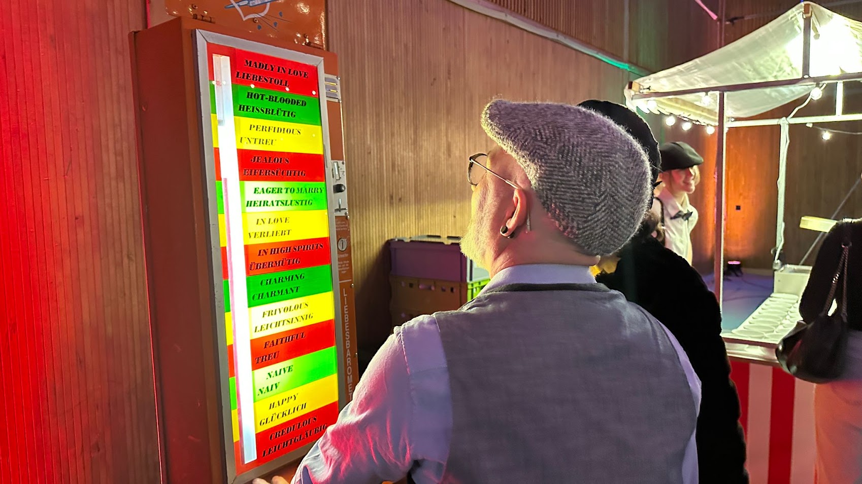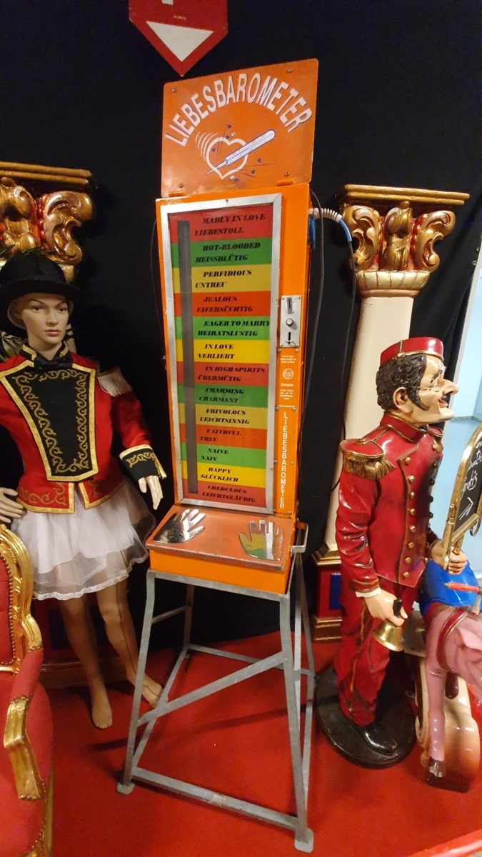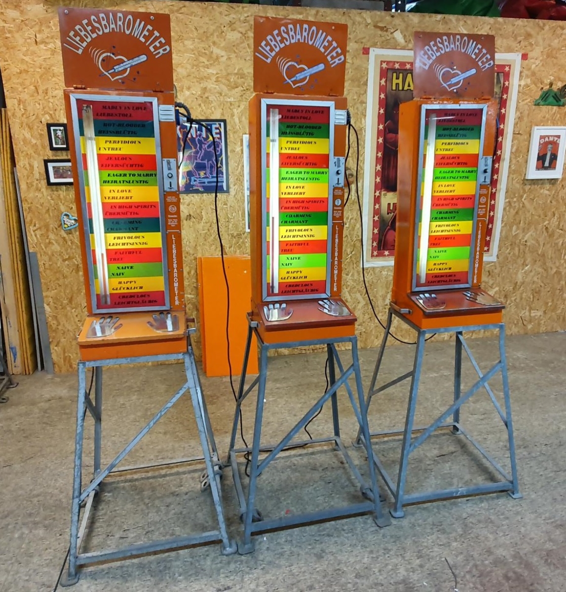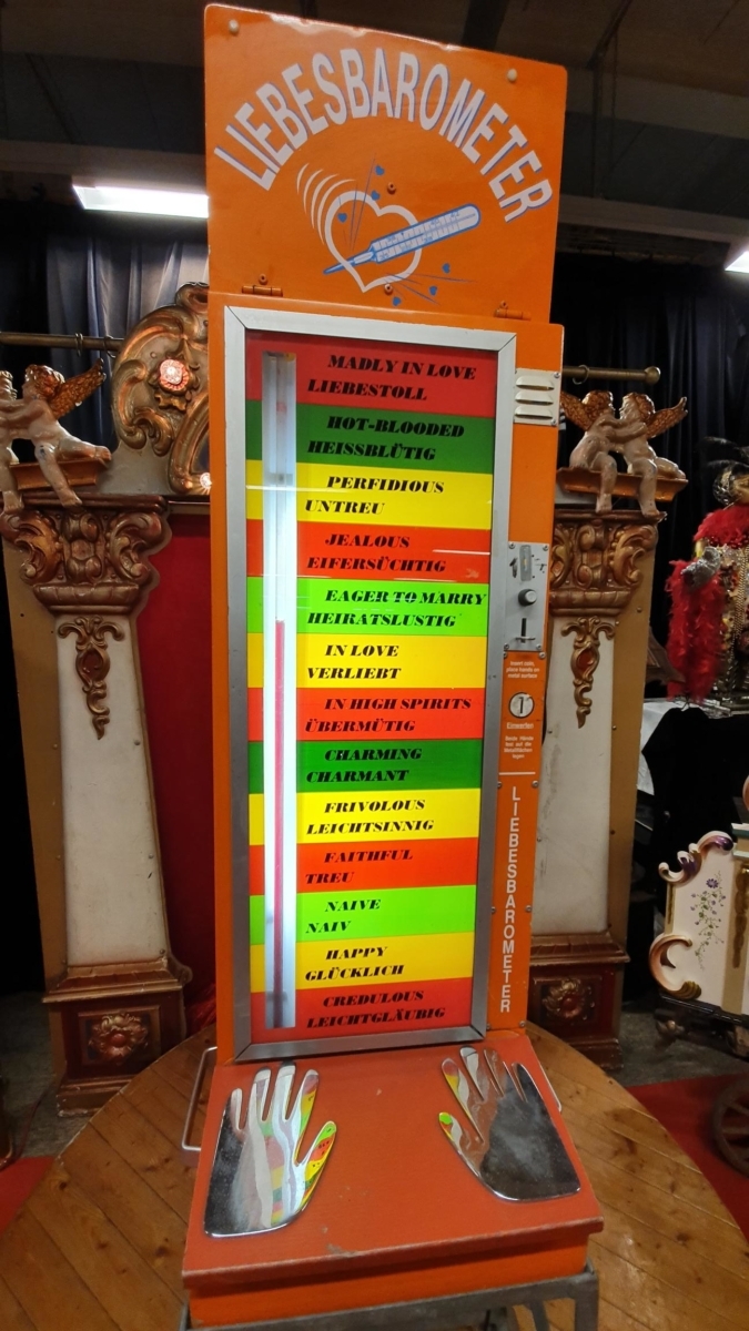 Dieser original Chilbi Automat aus den 50er Jahren zeigt Ihnen wie »Hot» Sie sind. Ein mit rotem Liebeswasser gefüllter Zylinder gibt nach einem Handauflegen Aufschluss über die Leidenschaft – die Glasader gibt Aufschluss, wer das Liebesbarometer gerade benutzt hat: eine Schlafmütze oder ein Filou, ein kaltblütiger oder ein liebestoller Mensch. Der Nostalgieautomat schlechthin.