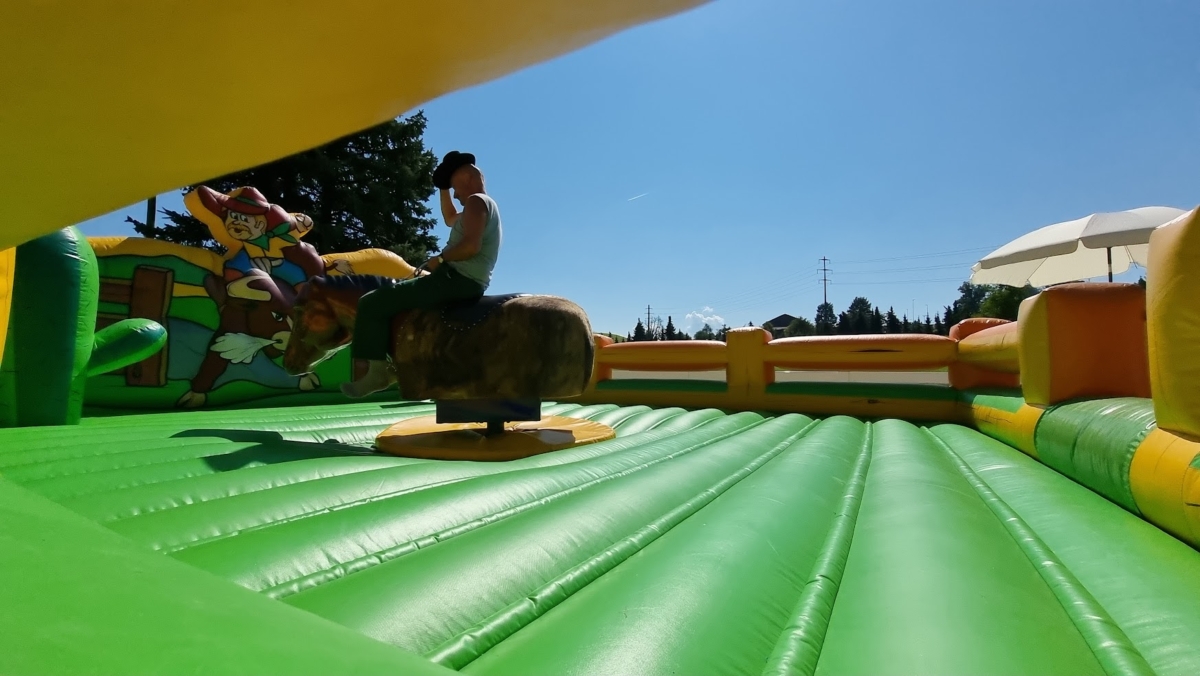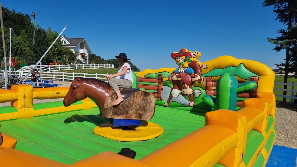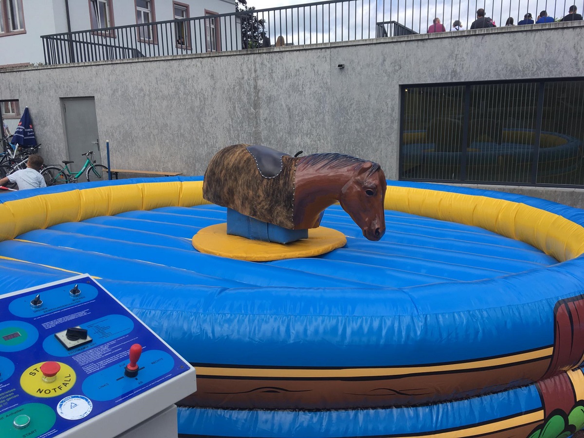 Wer hält sich am längsten auf dem Pferd? Völlig ungefährlich, können hier die Teilnehmer ihr Glück versuchen. Wer abgeworfen wird fällt leicht in die luftgefüllte Sicherheitsumrandung. Ein Spass nicht nur für den Teilnehmer, sondern auch für die Zuschauer.