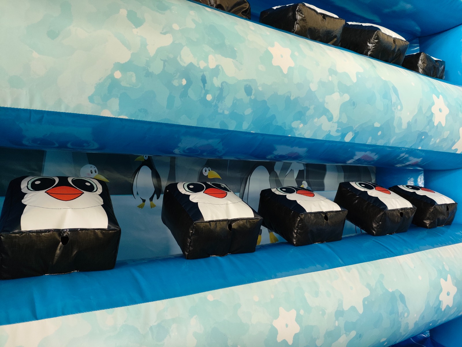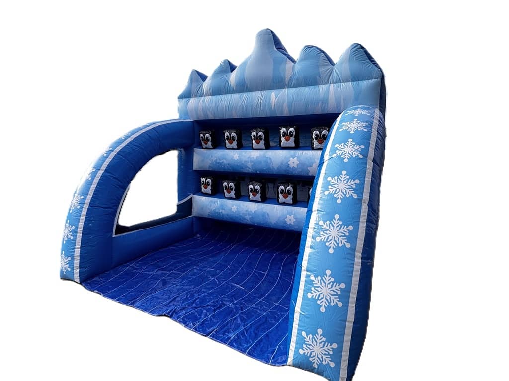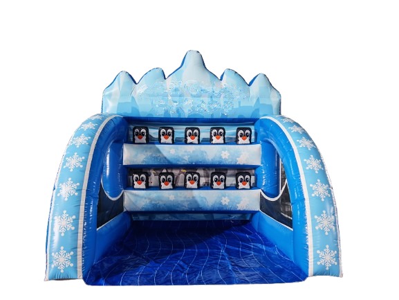 Aufblasbares Wurfspiel. Ein super Spassfaktor für Personen jeden Alters. Fördern Sie die sportliche Aktivität Ihrer Besucher und tragen Sie spannende Wettbewerbe aus. Die Pinguine bewegen sich auf und ab durch den Luftstrom des Gebläses. Die Kinder müssen nun mit Säckchen die Köpfe zu Fall bringen. Diese kippen dann nach hinten um. Wirft man zu doll, kommen diese wieder vor.