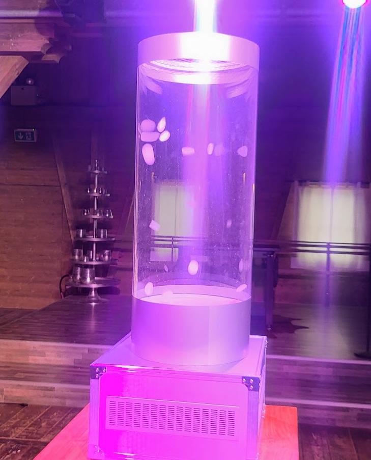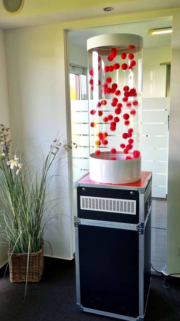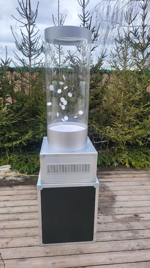 Immer wieder beliebt ist das Schätz- und Ratespiel. Unsere Schätzbox als Luftsäule fällt auf. Im Innern der Säule wirbelt es farbige Plättchen umher. Wie viele?, das wissen nur Sie!