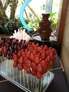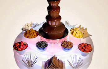 Mit unserem Schokoladenbrunnen bieten Sie Ihren Gästen ein ganz besonderes Dessert! In dem Schokobrunnen können Früchte, Marshmallows und andere Leckereien in flüssige Schokolade gedippt werden, die frisch aus dem Brunnen heraussprudelt. Er kann mit bis zu 8 kg Schokolade gefüllt werden. Bis zu 70 Personen können sich so an den süssen Köstlichkeiten erfreuen.