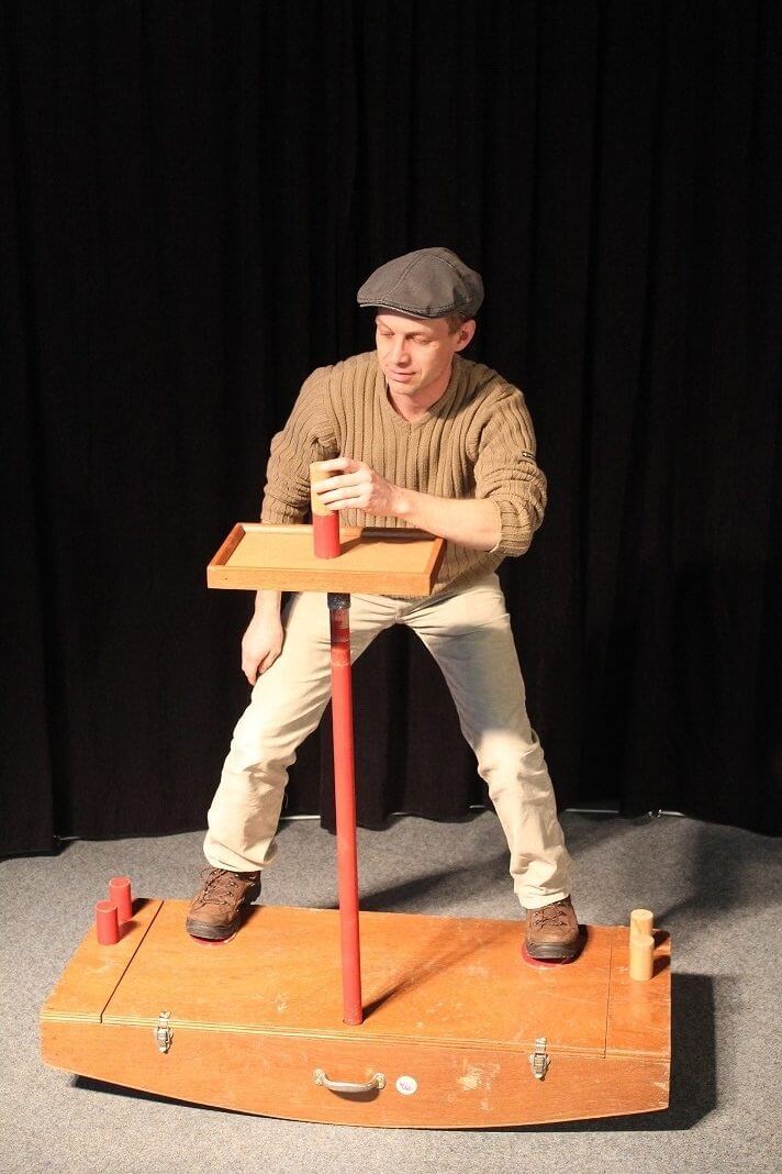 Wer kann die meisten Holzklötze aufstapeln und gleichzeitig die Balance halten? Abwechselnd von links und rechts vom Fuss weg, werden die Klötze auf dem Tablett gestapelt. Ist schwieriger als es ausschaut :-)