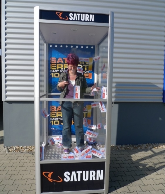 Das perfekte Promotiontool für Ihren Anlass. Unsere Wirbelwindbox, auch Wirbelbox, Dollardusche, Hurricane Box oder Cashbox genannt, ist zerlegbar und in wenigen Minuten aufgestellt. Die Gewinnbox ist in modernem Design gehalten und mit LED, Zeitanzeige und Raucheffekten ausgestattet. Durch die grosszügige LED Beleuchtung im Inneren ist der Spieler immer im Focus.
