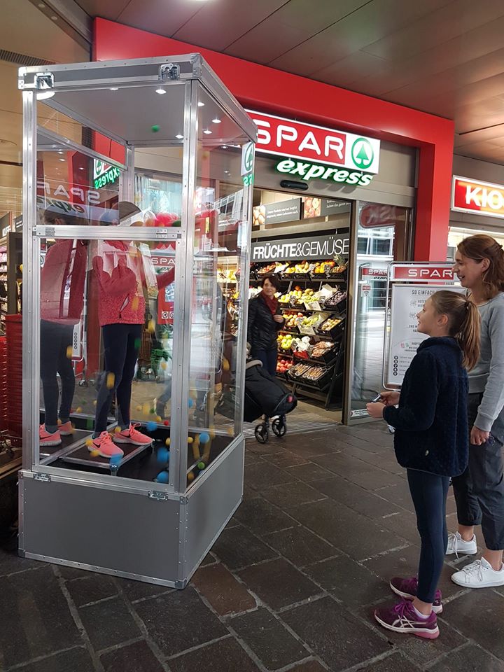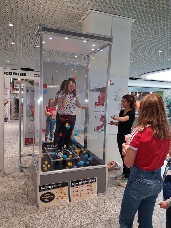 Das perfekte Promotiontool für Ihren Anlass. Unsere Wirbelwindbox, auch Wirbelbox, Dollardusche, Hurricane Box oder Cashbox genannt ist zerlegbar und in wenigen Minuten aufgestellt. Es gilt die meisten der kleinen Schaumstoffbälle, oder das eine rote Bällchen unter hunderten zu fangen.