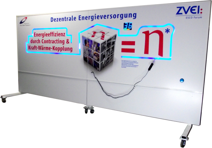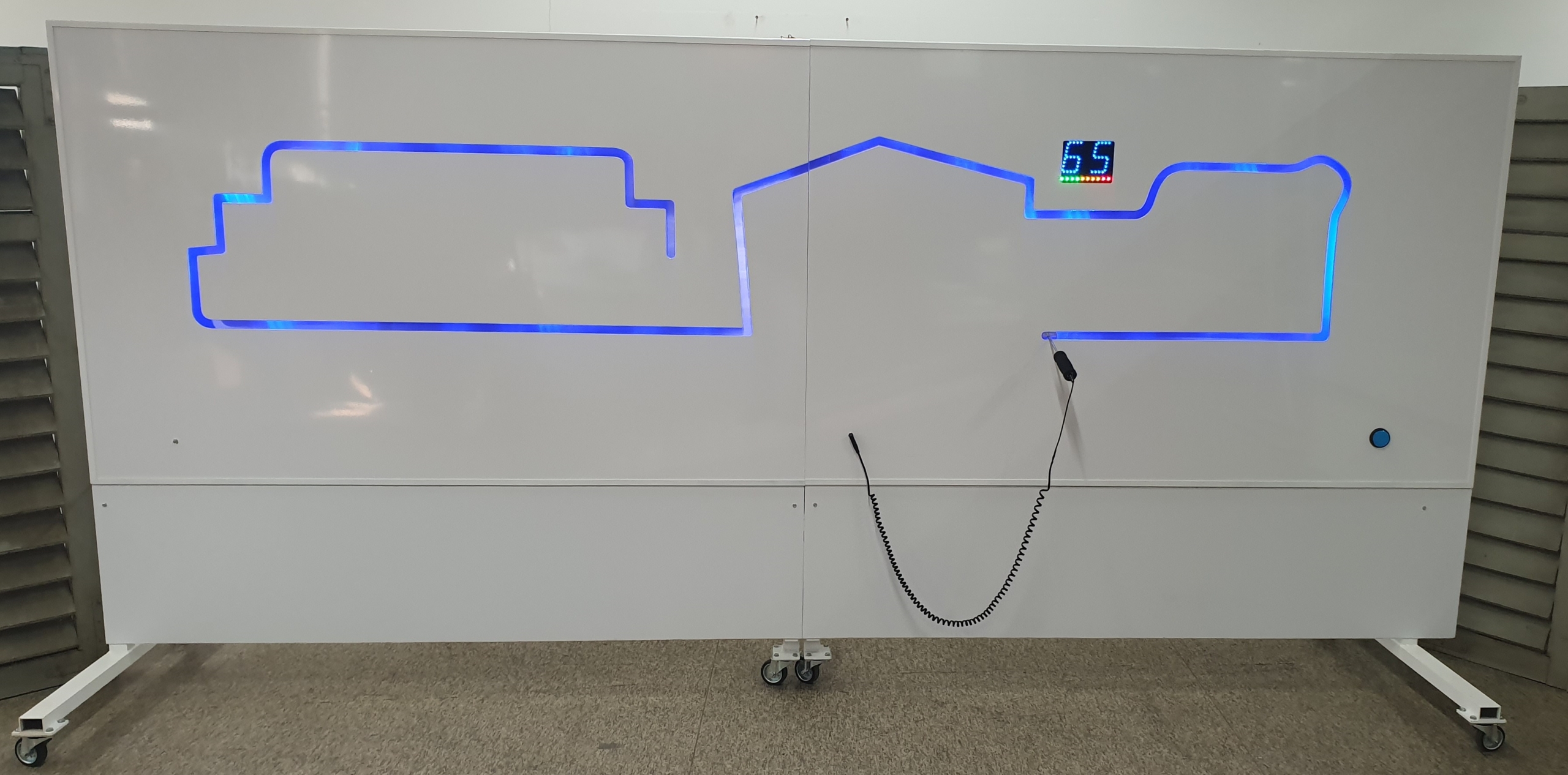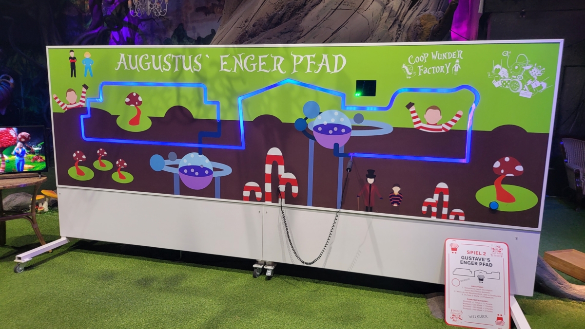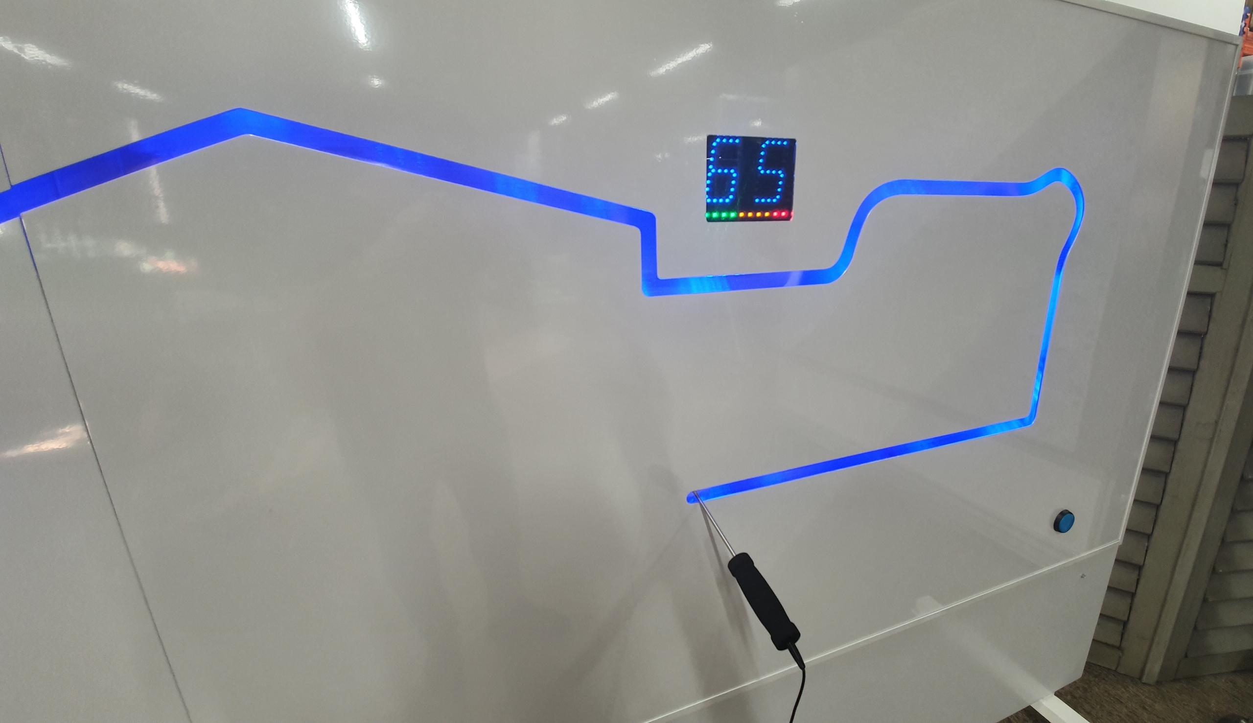 Durch die Hinterbeleuchtung der Führungsnut wirkt diese Variante des Heissen Drahts besonders plastisch und dreidimensional. Die Farben der Beleuchtung werden an die Gestaltung und das Kunden-CI angepasst.